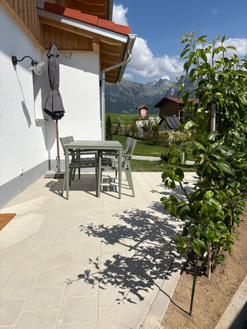 Möblierte Südterrasse mit seitlichem Bergblick