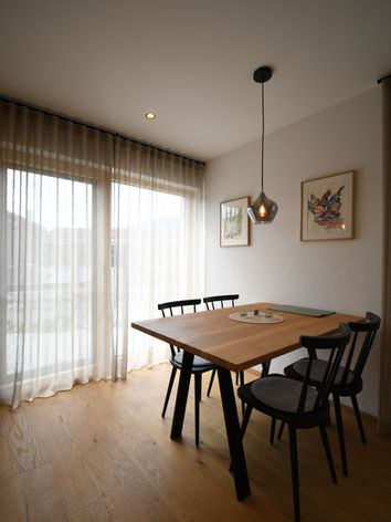 Die Ferienwohnung Rosmarin bietet auf 55 m² Platz für bis zu 4 Personen und befindet sich im Erdgeschoss. Sie verfügt über ein Schlafzimmer und ein Ausziehsofa mit richtiger Matratze (160x200cm), sowie ein modernes Badezimmer mit Walk-In Dusche. Der offene Wohn-/Essbereich umfasst eine gut ausgestattete Küche mit zwei Kaffeemaschinen (Kapsel/ Filter), Geschirrspüler, Backofen, Toaster und Wasserkocher. Zudem gibt es zwei Fernseher, kostenloses WLAN sowie einen Schreibtisch als Homeoffice-Möglichkeit. Fußbodenheizung, Raffstores und ein Parkplatz am Haus sorgen für zusätzlichen Komfort. Die Ferienwohnung ist eine Nichtraucherwohnung und bietet mit ihrer Südterrasse einen seitlichen Bergblick.